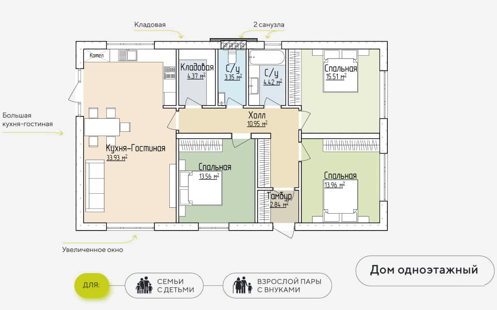 Индивидуальный одноэтажный дом из газобетона со свободной планировкой - только для 1-3 очереди. С витражом - только для 4-6 очереди. Участок на выбор от 5 соток.